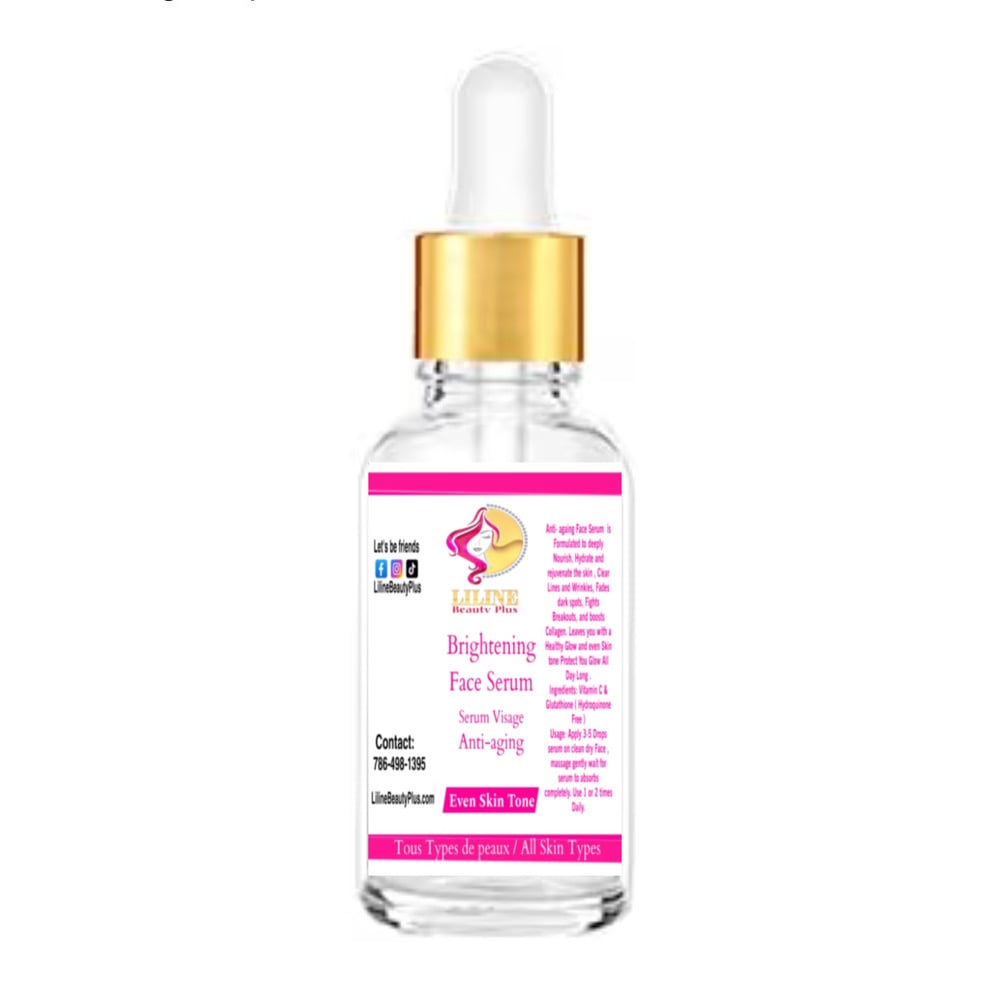 Anti- againg Face Serum is Formulated to deeply Nourish, Hydrate and rejuvenate the skin , Clear Lines and Wrinkles, Fades dark spots, Fights Breakouts, and boosts Collagen. Leaves you with a Healthy Glow and even Skin tone Protect You Glow All Day Long .